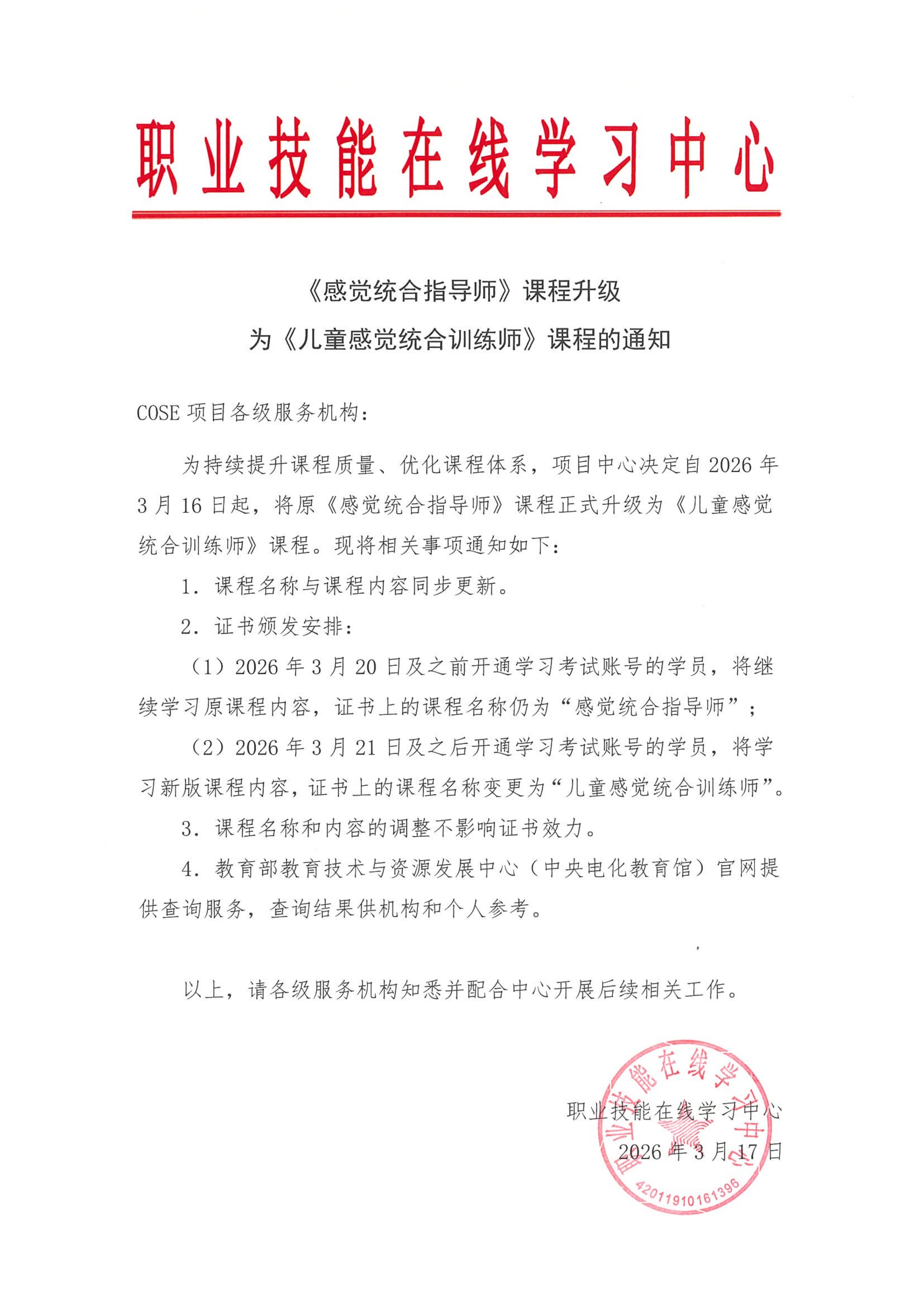 (1) 2026年3月20日及之前开通学习考试账号的学员,将继续学习原课程内容,证书上的课程名称仍为“感觉统合指导师”。